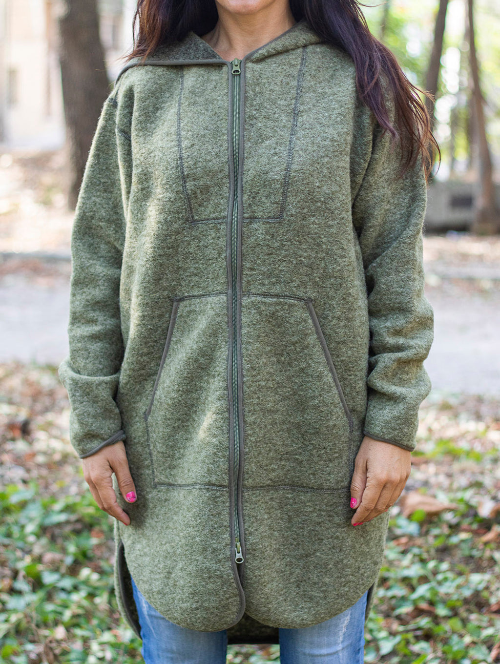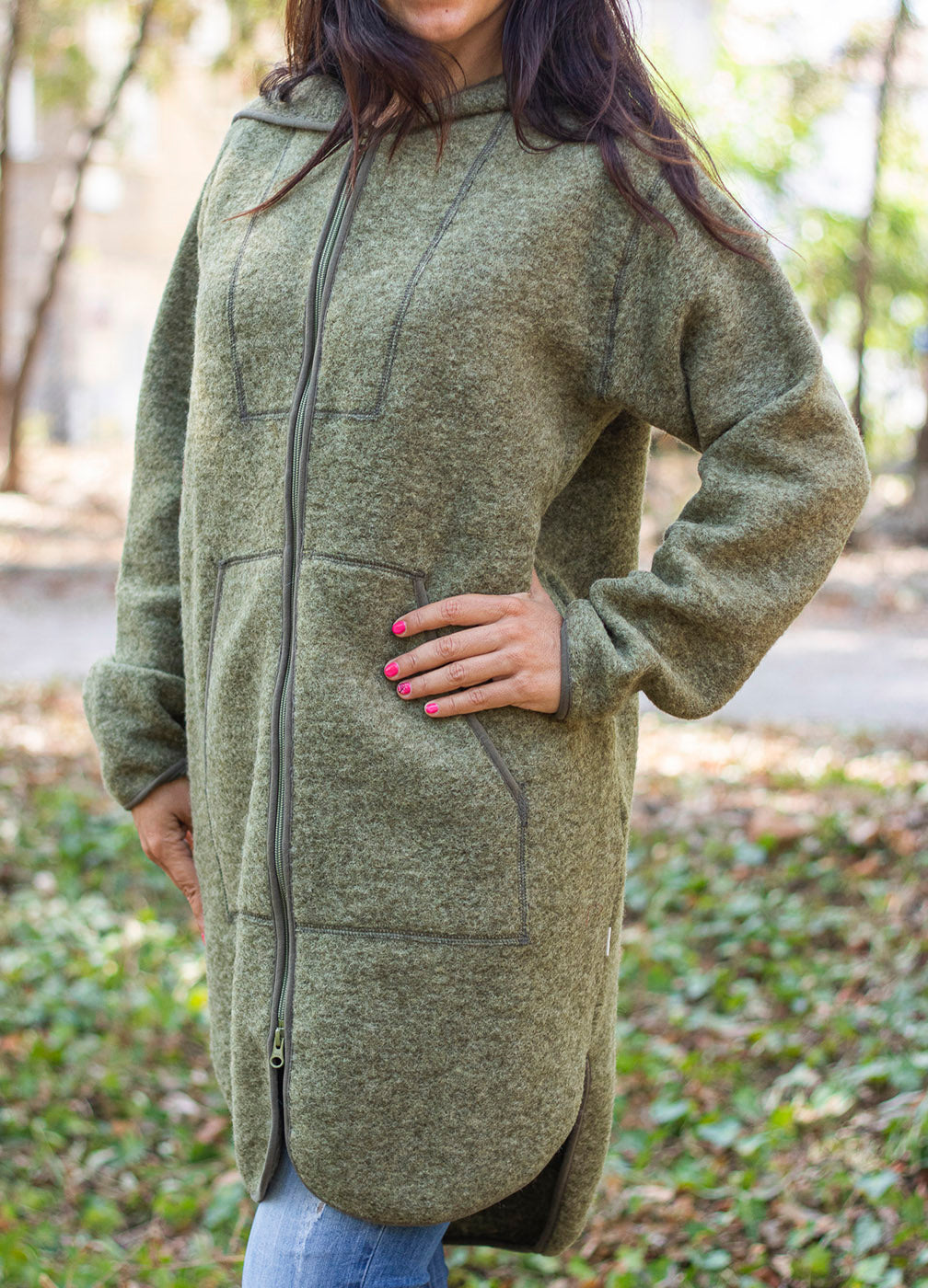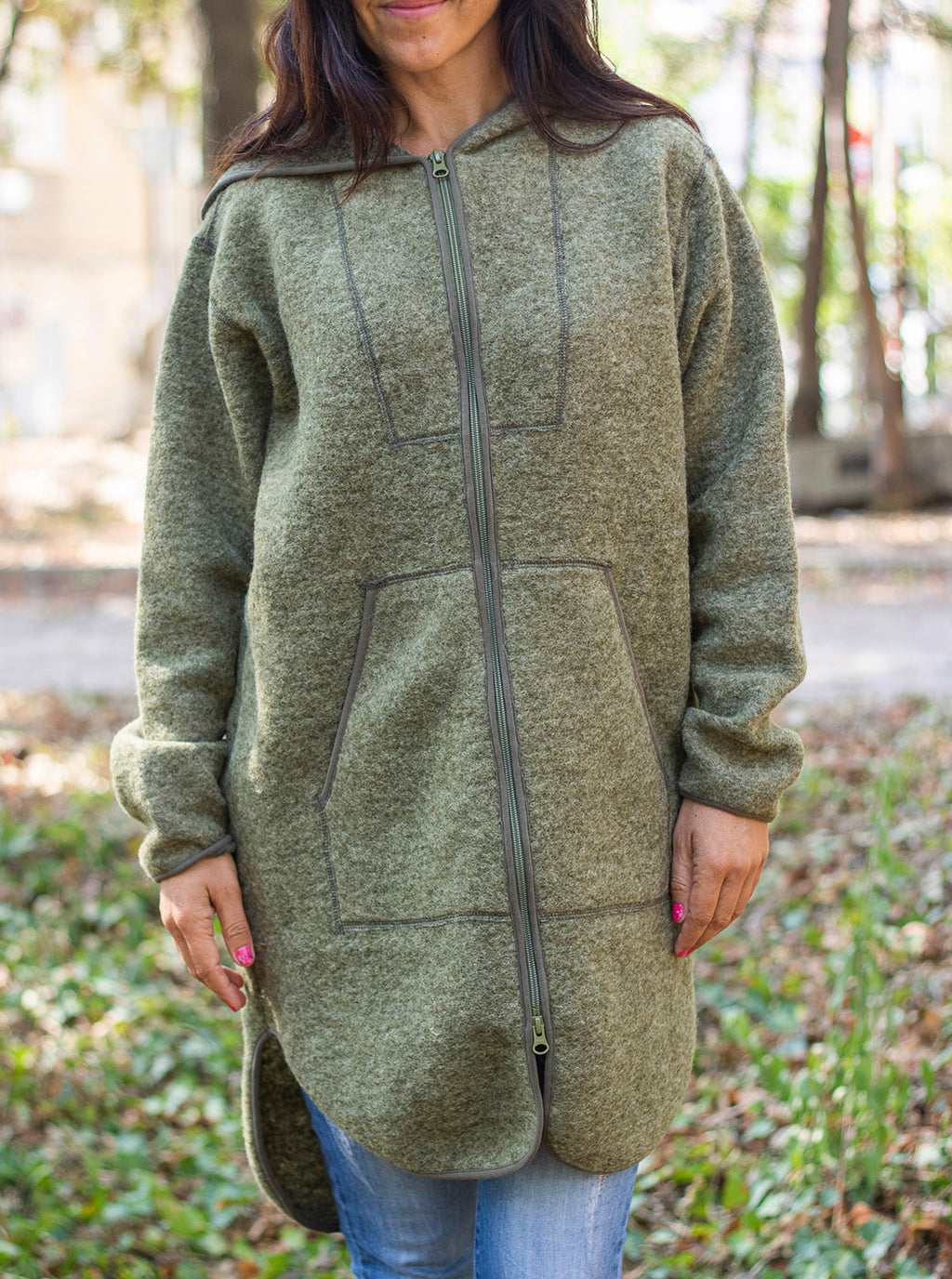 Думата, която най-добре описва това е изделиe e: ТОПЛИНА. Изработено от вълнен филц съдържащ - 80% органична вълна и 20% органичен памук. 100% естествени материали за една по-добра връзка с природата. Наслади се на лекотата и  удобството на тази дреха, идеална за преходните сезони.