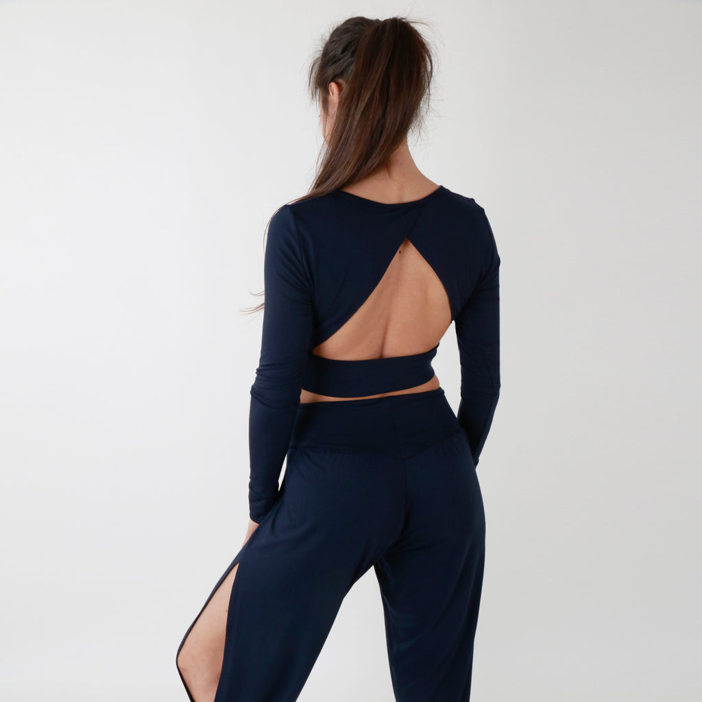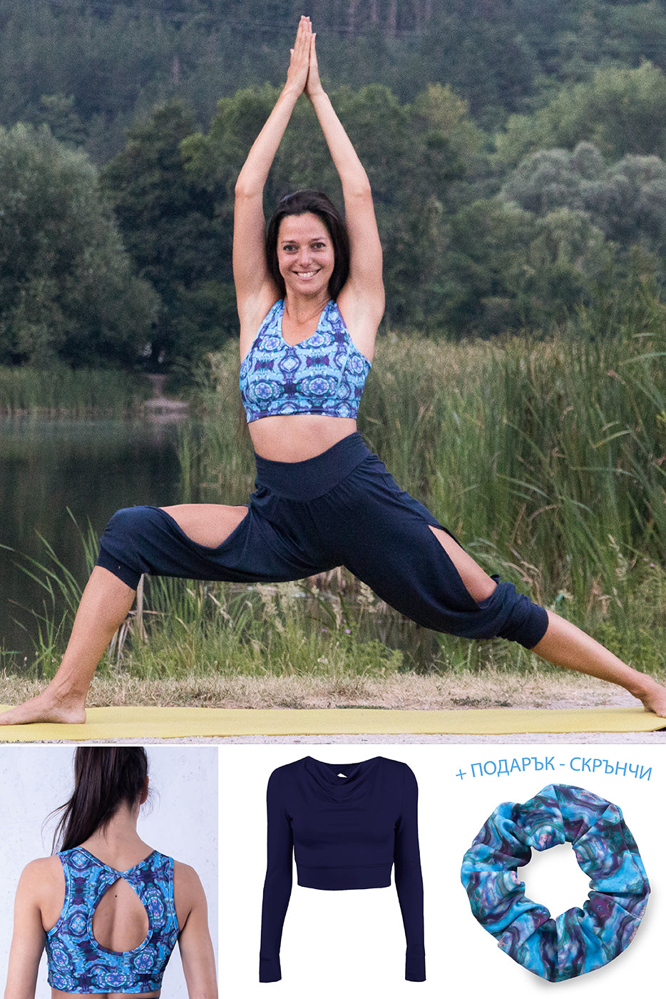 Сет БРИЗ Тънмо син - Шалвар с цепка, бюстие и блуза с гол гръб + ЛАСТИК ПОДАРЪК !